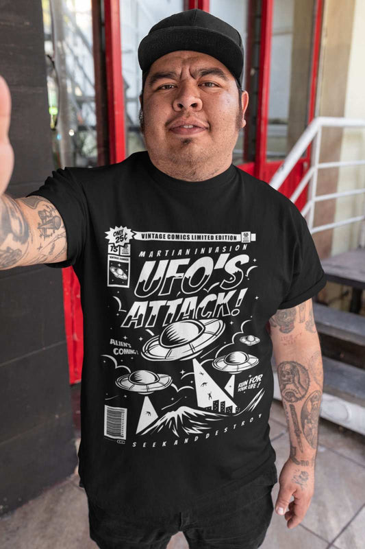 Retro Comic Book Style UFO's Attack T Shirt Funny Alien 50s Cinema Style Design