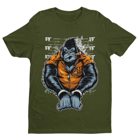 Cell Block Primate Funny T Shirt Ape Gorilla Mugshot Handcuffs Smoking Cigar
