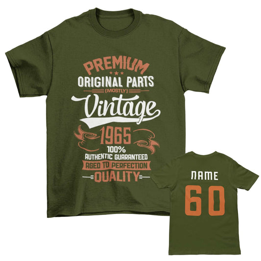 Personalised Vintage 1965 Original Parts 60th Birthday 2025 T Shirt Name on Back