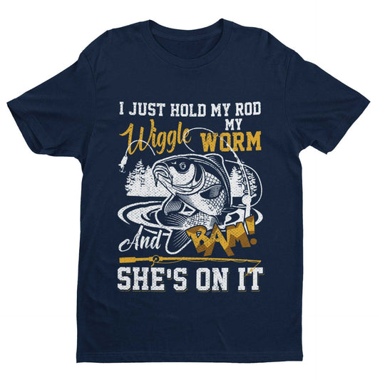 Funny Rude Fishing T Shirt I Just Hold My Rod Wiggle My Worm And BAM She's On It