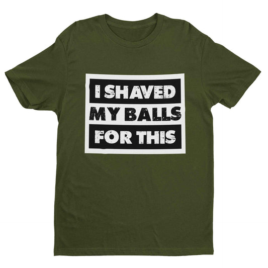 • Black funny sarcastic rude t shirt with white text saying "I shaved my balls for this" in bold block letters.